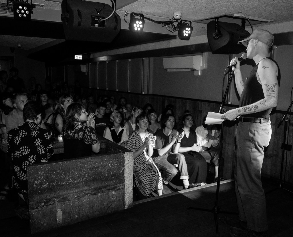 Beyond the cross-pollination of words and images between London’s music and poetry is a sharing of approaches to events and performance, which feels like it has been particularly aided by the necessarily accepting open mics. At Wrld Bldr on the Saturday after Blue Shout, it felt as though I were watching an allegorical graduation of open mic stalwarts to a new platform with a slightly broader audience. “It’s like ‘Avengers Assemble’!”, organiser Rake excitedly tells me, speaking of how the night brings together various brilliant performers from different but related fields, along with their Venn diagram audiences. Paddy Hornby, who read at Wrld Bldr but also plays music as Howell Owdly and with Boil King, affirms this sentiment, glad to be looking out to a crowd he does not know so thoroughly well as the Gobjaw regulars. Indeed, his performance seems to grow in this environment, rantings sharpening as he paces a smoky George Tavern stage late on Saturday night. The work thrives in this festive, sweaty atmosphere, a little looser than the earlystart poetry open mics.