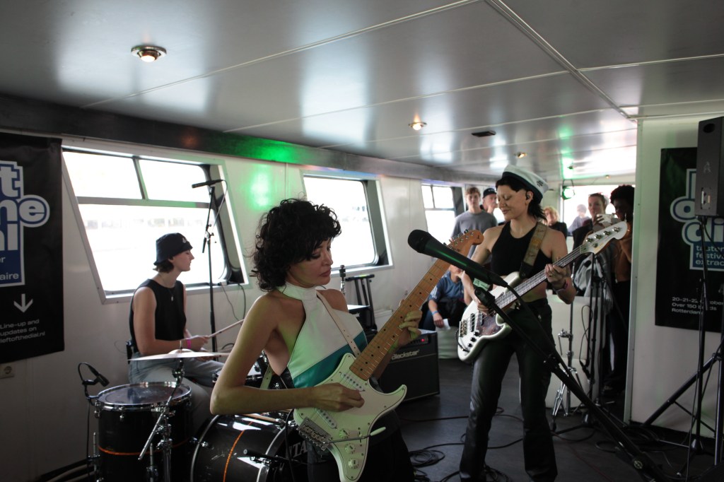 There’s no better hangover cure than fresh sea air wafting over the river Maas, and with this thought it mind we boarded a boat for the traditional ‘Bands On A Boat’ edition of Left Of The Dial. With acts such as deep tan, Eades, Beige Banquet and Gus Englehorn soundtracking the 1 hour return trip up and down the Maas and under the Erasmus bridge, this was certainly a one-off experience. It took approximately 10 minutes to re-find our land legs, a suitable amount of time for the short zigzag to catch London post-punk hotshots Deadletter, a festival highlight.