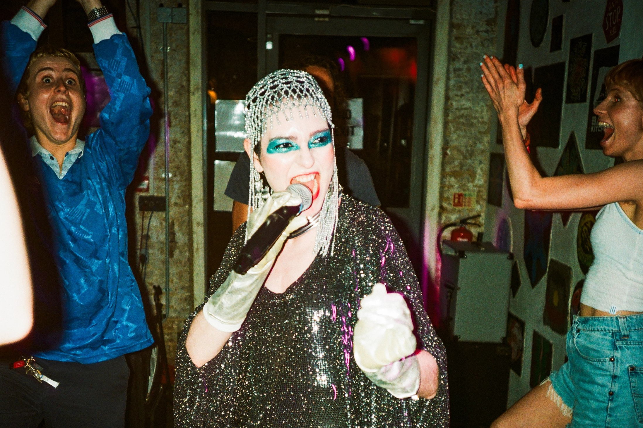 It’s Strongroom, though that sees the event’s best performer. Vanity Fairy is a bit like if a fortune teller reads your future but delivers it in an 80s synth-pop montage with Bee Gees vocals. Dressed in a glittery cape and 1920s headpiece, her stage presence is extraordinary: She dances across the stage, glides around the room and exits and re-enters through any door she can find. Halfway through she draws back the curtain, revealing a huge glass window at the back of the stage, and starts performing to confused Shoreditch Saturday-nighters. There’s a touching moment where a random drunk bloke and her touch hands through the glass like prison-divided lovers.