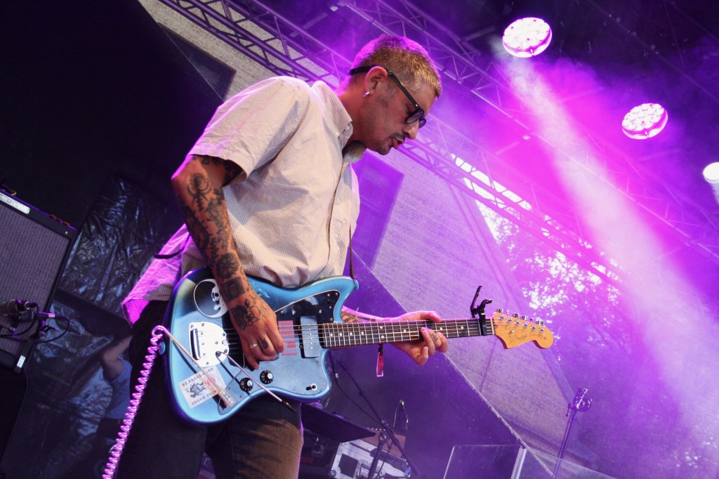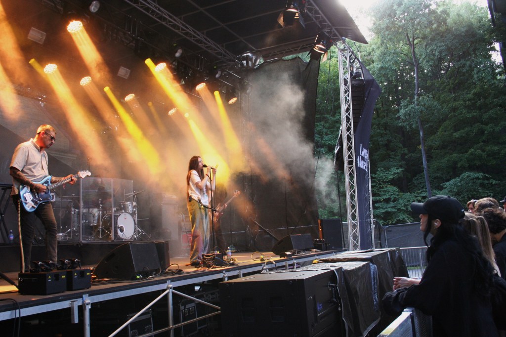 On ‘Don’t Press Me’, the rhythm teeters between rigid structure and restless disorder. Guitars grow increasingly frantic, a brief but cutting moment of harsh dissonance and lyrical surrealism. The set flows with the same steady momentum as the river beside the stage, its sound still audible in the quiet between songs. The tracks arrive in rapid succession, audience interaction kept to a minimum, yet the band’s unfaltering stage presence holds the crowd in rapt attention.