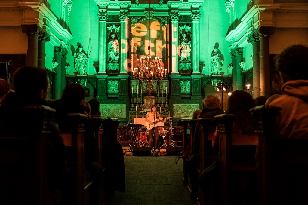 The solitude of the solo singer/songwriter is another of the weekend’s prevailing fixtures; moments of calm reassurance for those more fragile, ‘sore-headed’ sections of the weekend. Maddie Ashman suits the opulence of the Paradijskerk church: as we take our pews we’re met with a contemporary take on Latin choral song. In a set which also preaches the virtues of microtones and drops fat breakbeats – Jockstrap style – it’s her crafty use of backing track that’s just so absorbing. As she flits between vocals, cello, keyboard and sampler with angelic grace, we can’t tell which sounds are coming from where. Everything sounds so perfect, so balanced, so beautiful. “Beautiful” is the word too for Ninush’s set at that same venue. Her first ever festival appearance is rapturously received; the audience quite literally bang the pews in appreciation. And fair enough. When the ensemble of violin, flutes, and the guitar rhyme as one, it’s genuinely heart-melting. Coming all the way from L.A, Prewn‘s solo set is darker, moodier, studded with grit. The jaggedness of her naked electric guitar, along with the guttural growl in her vocal, brings a fresh sense of ghostliness to the songs from her excellent new album ‘System’.