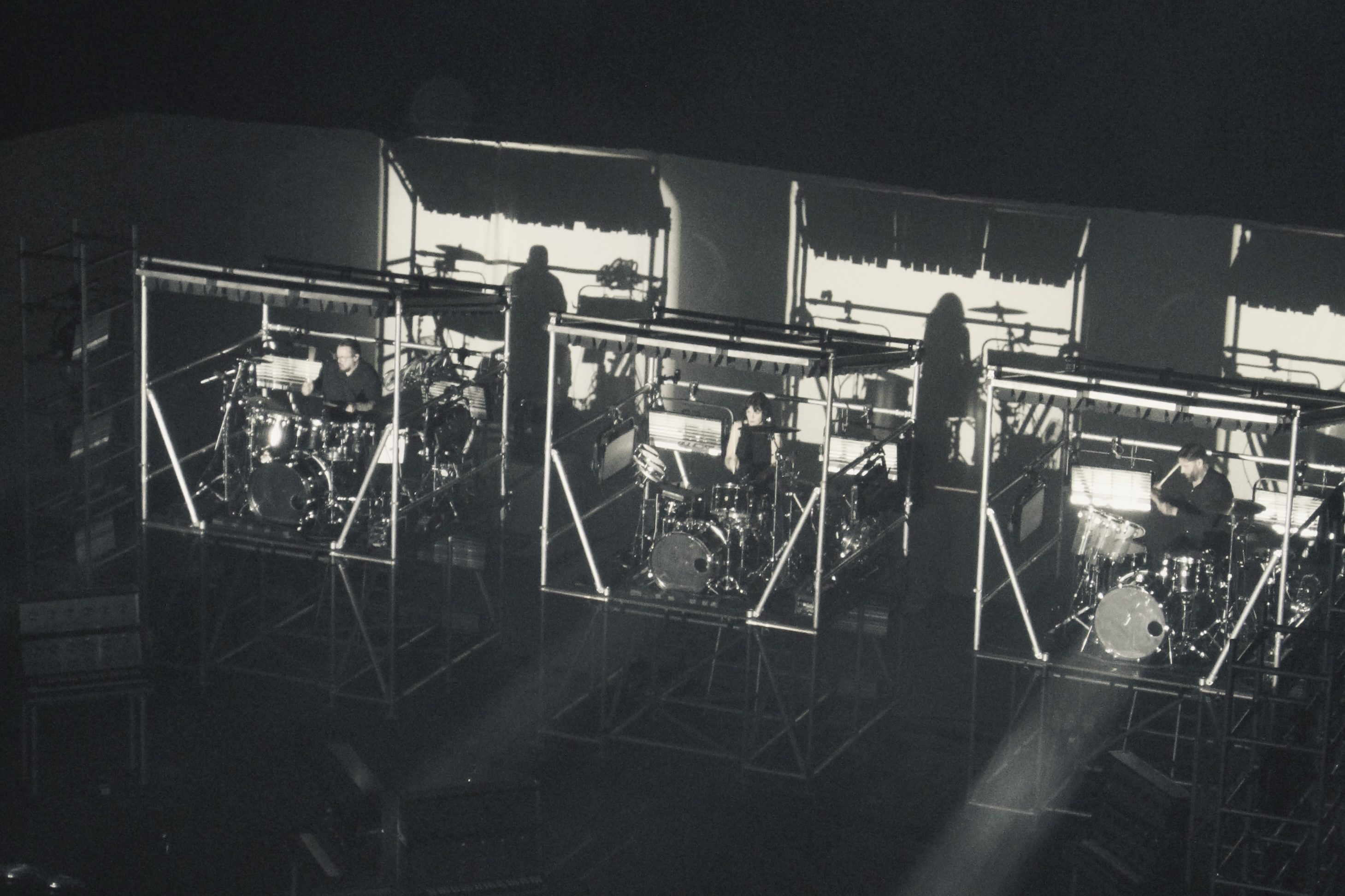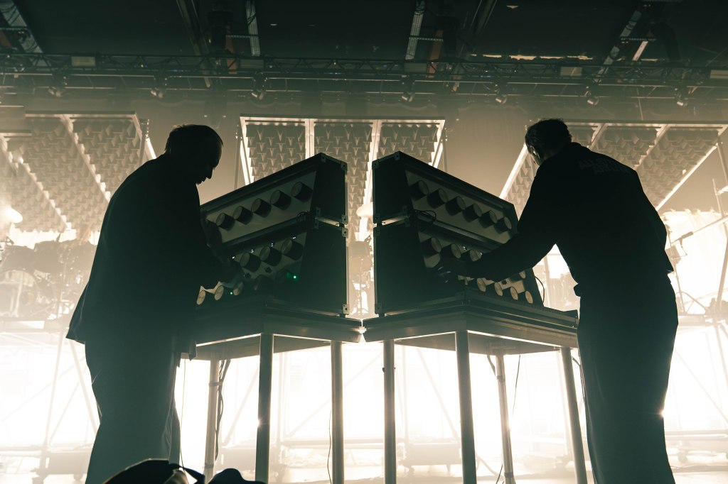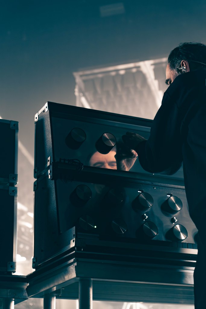 Like, the stage set itself would not be out of place in a Brechtian theatre production. Three columns of platformed scaffolding (more on that later) with a white sheet wrap all around the stage perimeter. Industrial-sized lights dotted around are fully exposed to the audience, as are the custom-build synthesizers. Staggered in military formation, their cartoon-sized dials and light-up keyboards look like retro-futurist control-panels from the Starship Enterprise. Just when I think those dials are there for show, a voiceover mid-set factually breaks down the sound-rig. Yep. the dials do stuff.