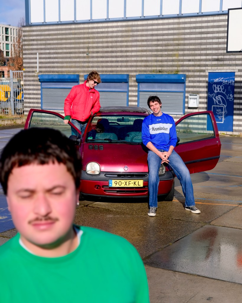 Parker Fans are a unique prospect. Formed in Amsterdam among a flourishing Dutch scene, their music brings indie attitude to a floor-filling dance sound. Their live show is intensely impactful and tremendous fun, its energy perhaps best captured on 2024 EP ‘Pool of Fish’. This month they are back with new EP ‘Bark!’, a slightly more lucid collection but nevertheless packed with addictive grooves. Playful pan flute riffs dance through intense opener ‘Enemies’ and into the looser title track, which is wound tight around a gem of a bassline. The EP’s dance climax is hit with ‘I’m Your Dog Baby’, which combines a ridiculously huge house keyboard riff with lyrics reminiscent of the knowing slickness of Confidence Man. Then things mellow out with closer ‘Verano Holandés’, an understatedly sprawling, shapeshifting piece. The band’s sound is really made by the contrast of the instrumentals provided by Sem Egter van Wissekerke and Thomas Geleijnse and the bold vocals of Kick Kluiving, who cut his teeth playing drums with Personal Trainer. As they prepared for the release of ‘Bark!’, we had a chat with the band about their story so far and the evolution marked by the new EP.